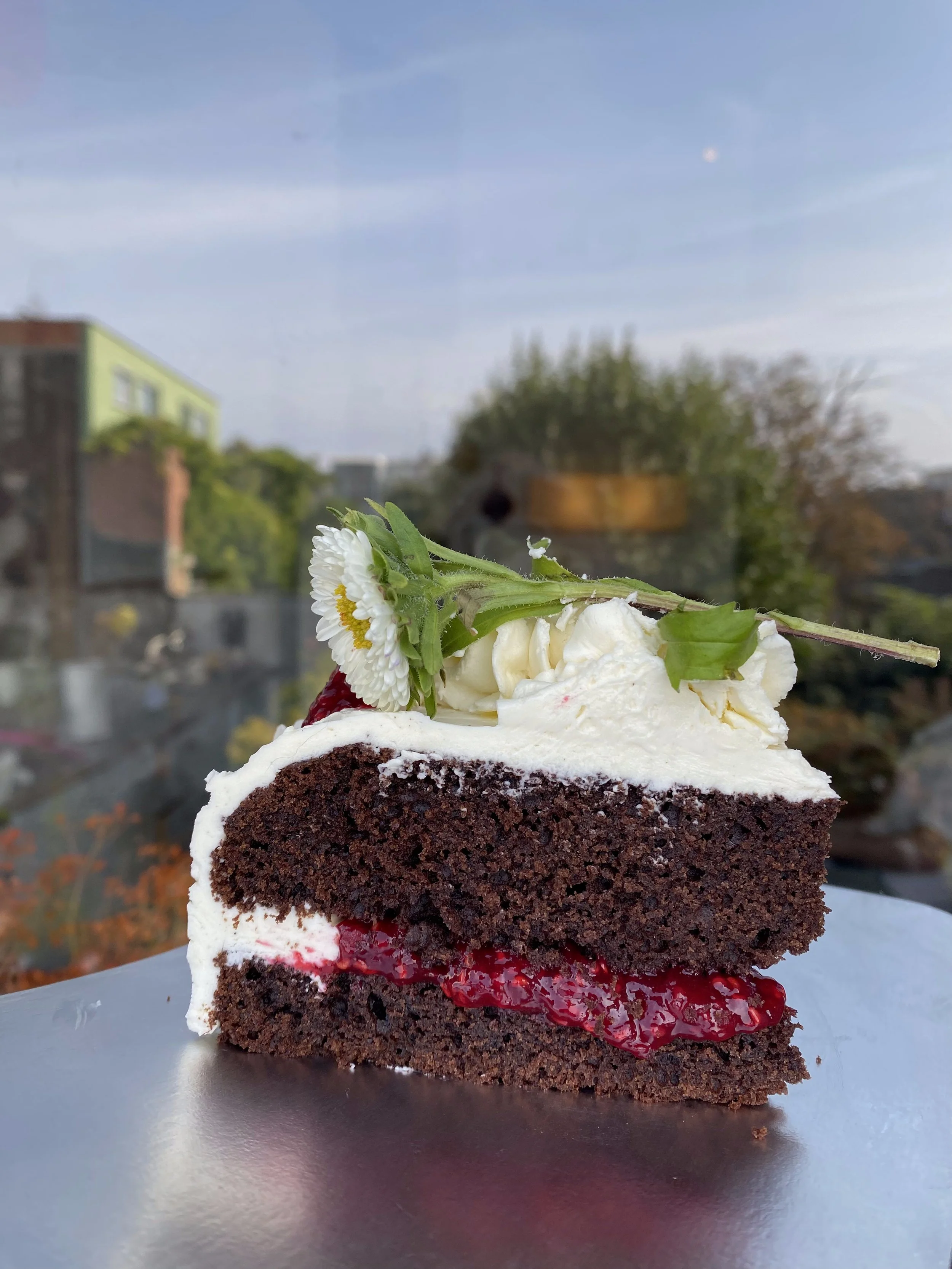This cake is wonderfully moist and rich — perfect as a simple loaf to enjoy throughout the day, or as a base for a celebration cake layered with frosting and raspberry filling (see picture below).