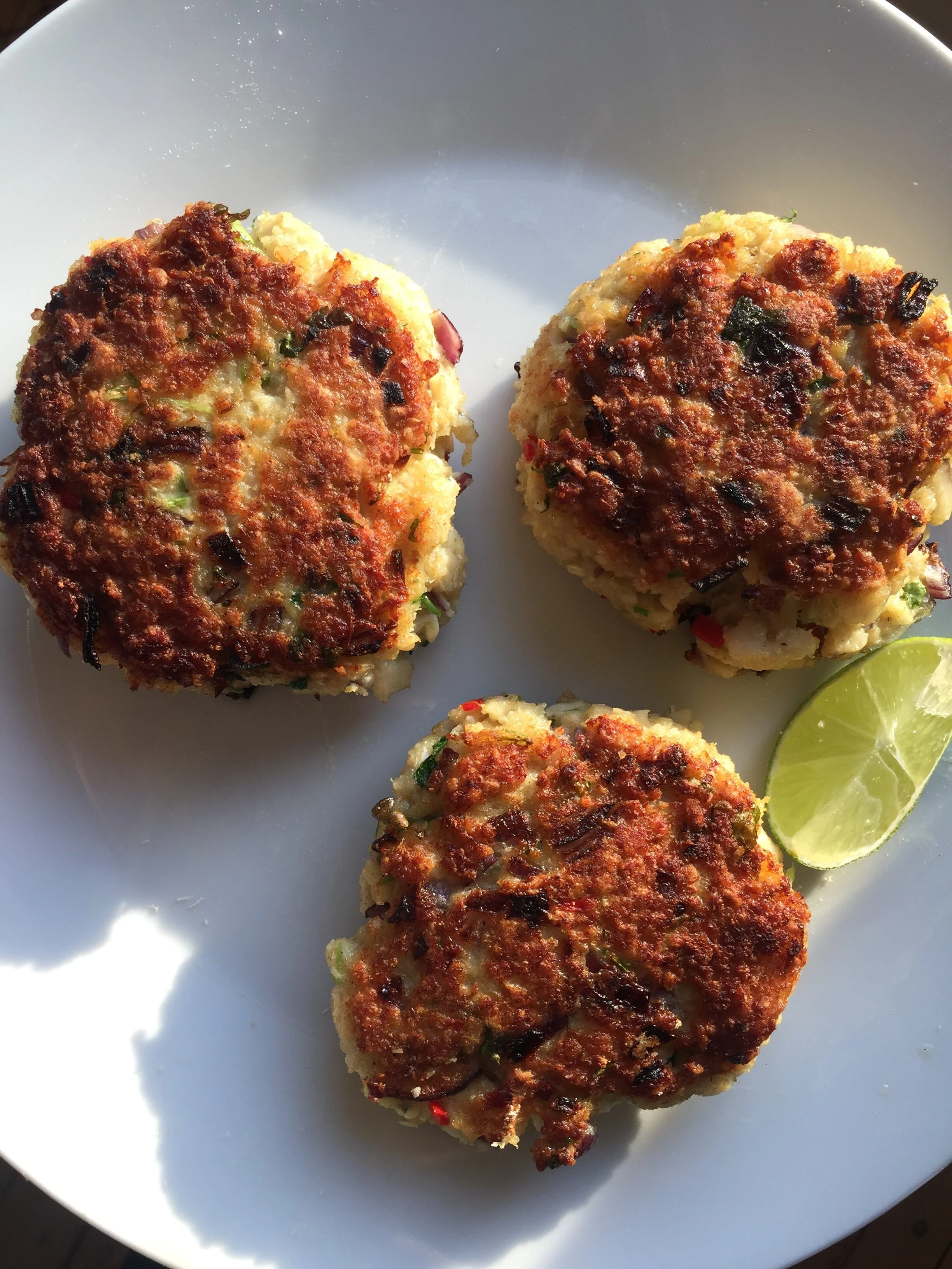 4. Add the spring onion, red chili, zeste of the lime, roasted coconut, flour, egg, curry paste and enough peper & salt. Make 2-3 burger of the mixture. Let this rest in the fridge for 20-30 minutes.